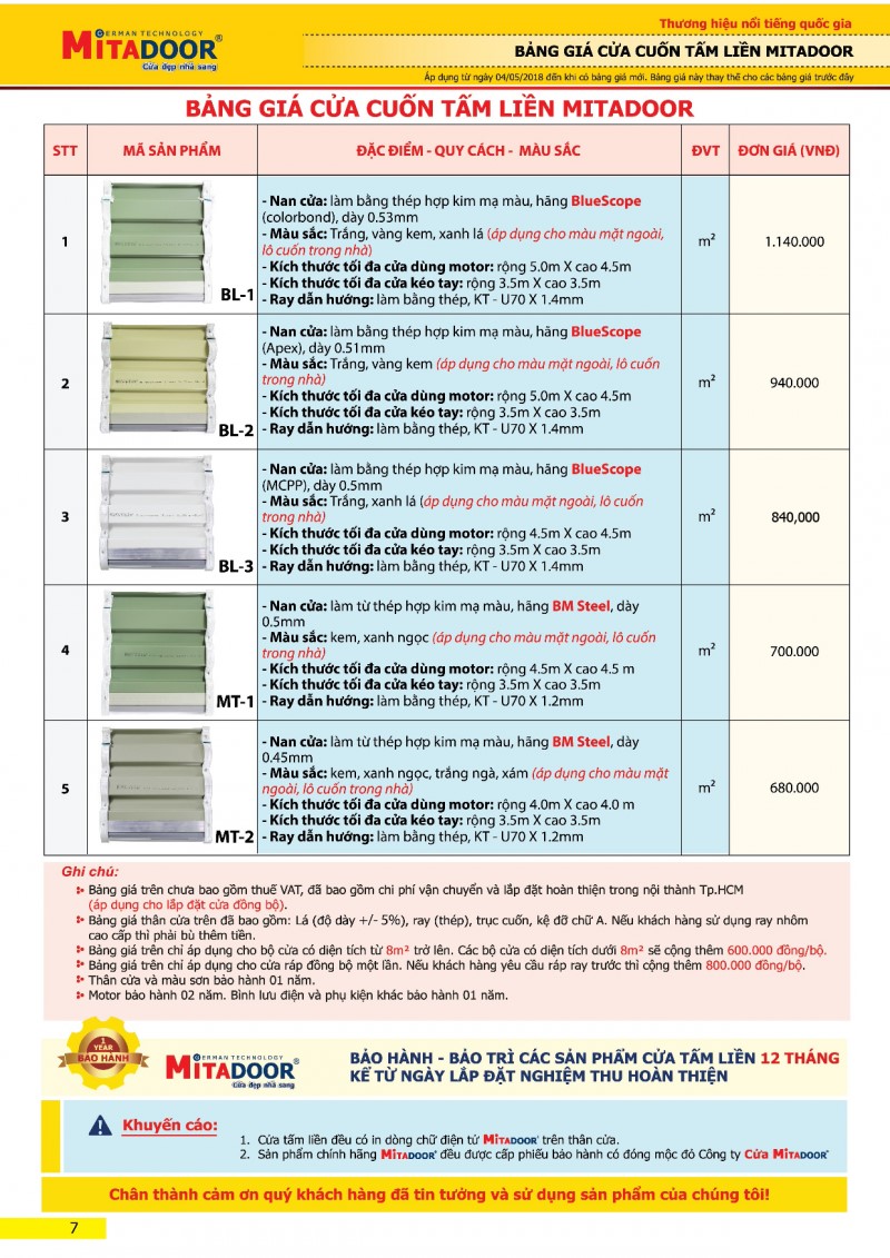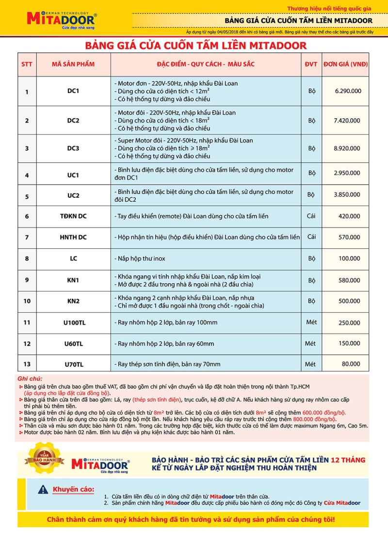 Cửa cuốn tấm liền Mitadoor là dòng cửa cuốn được lắp ráp bằng những tấm lớn, không dùng nan cửa xếp đan xen. Dòng cửa cuốn này hiện nay rất được nhiều các hộ gia đình, gara ô-tô và cửa hàng kinh doanh nhỏ lẻ tin dùng, vì thiết kế đẹp mắt, an toàn và chống bám bụi.