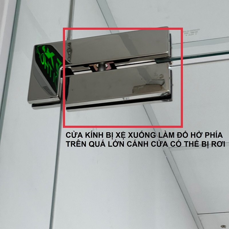 - Kẹp kính bị lỏng do bị teo ron hoặc mất ron, bị gãy, cốt ngõng phía trên bị lỏng dễ làm cho cánh cửa có thể bị đỗ ngã gây nổ kính. Nắp inox của kẹp kính bị lỏng, rơi mất. Ô chết trên đầu bị xệ xuống, cạ vào cánh cửa, đóng mở cửa làm rung cả toàn bộ vách kính.