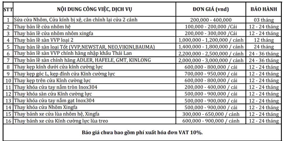 3 - Bảng giá sửa chữa thay thế linh kiện cửa nhôm - cửa kính